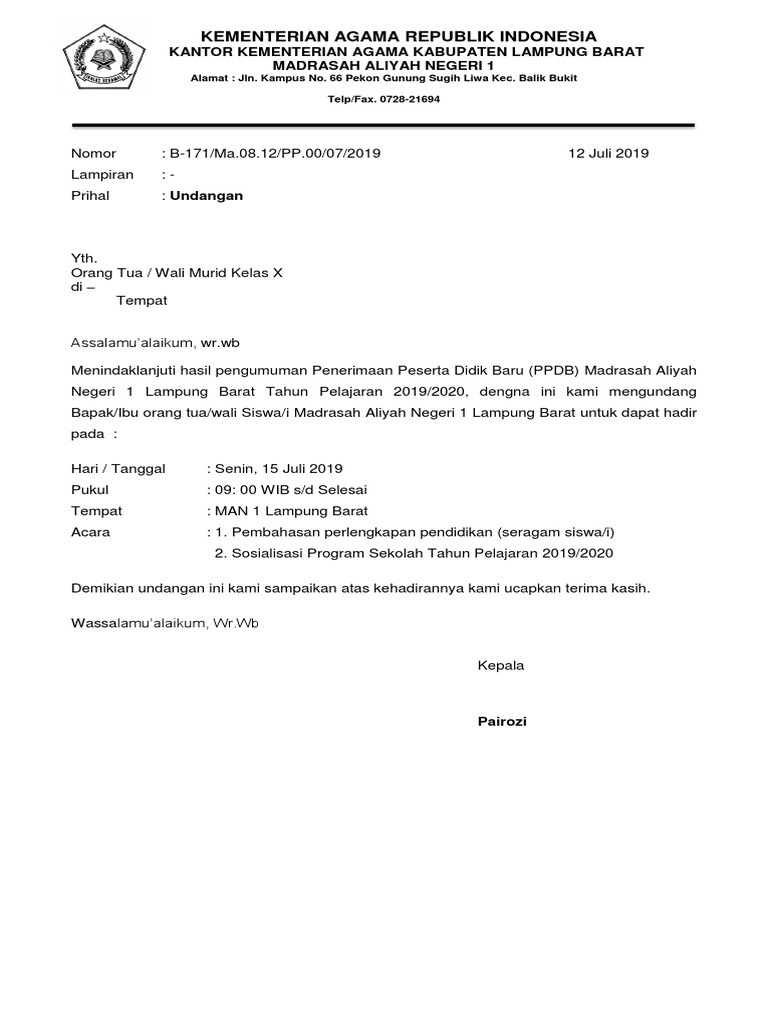 Undangan Rapat Koordinasi Wali Murid Kelas X Tp 2020 2021 Man Kota Tegal from mankotategal.sch.id Surat undangan rapat guru termasuk surat resmi. Bapak/ibu wali murid kelas 6 dan calon panitia perpisahan sesuai draf dibawah. Membuat surat undangan untuk acara rapat sekolah bersama orangtua wali murid memang tidaklah sulit, karena pada dasarnya hampir sama dengan pembuatan surat dinas pemerintahan lainnya. Maka dari itu, kami mengundang bapak/ibu untuk hadir pada rapat wali murid yang akan dilaksanakan pada : Surat undangan rapat undangan rapat sipo author camscanner subject surat undangan rapat sipo. Kepada yth, semua orang tua siswa/wali sma negeri 1 medan di tempat. Atas kehadirannya kami ucapkan terima kasih. By admin 01/12/2020, 2:37 pm 1.5k views 3 comments.