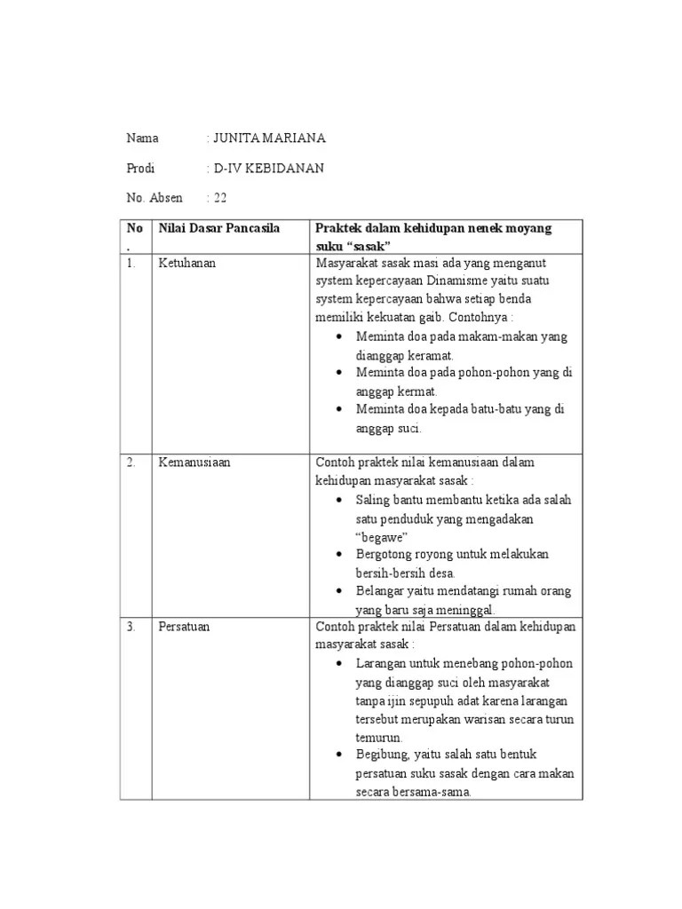 Kemanusiaan yang adil dan beradab; Membiarkan orang lain menjalankan kepercayaan dan keyakinan. Kelima sila tersebut ialah ketuhanan yang . Nilai, yaitu ketuhanan, kemanusiaan, persatuan, kerakyatan, dan keadilan. Contoh nilai ketuhanan dan ketaqwaan: